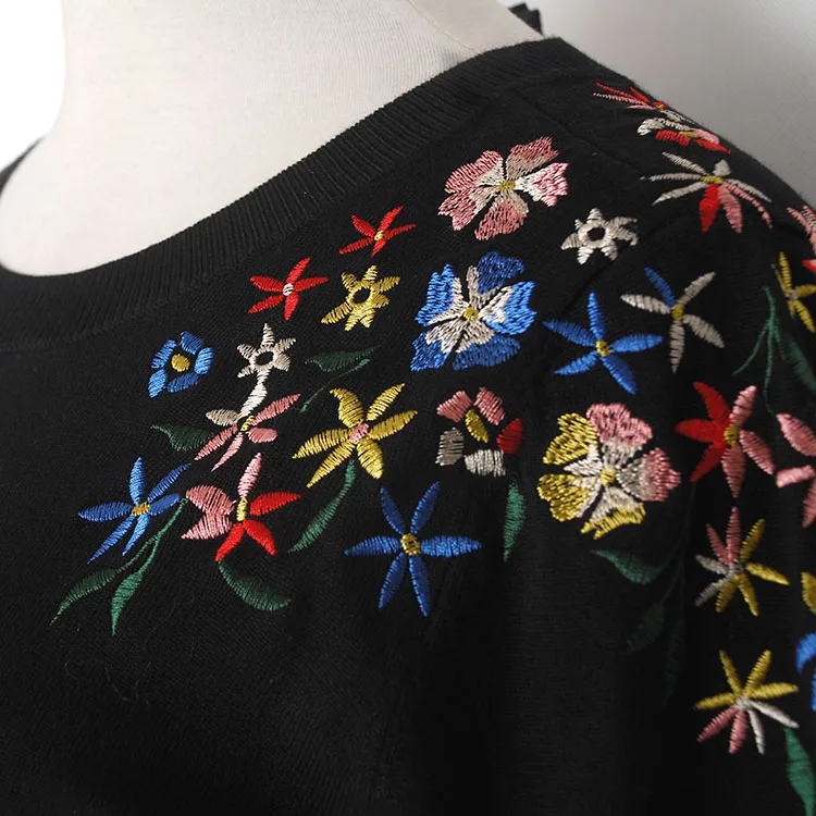 New YUNINYOYO shoulder and sleeves with Fine little flower embroidery knited t-shit pullover autumn thin sweater with ribbon on back