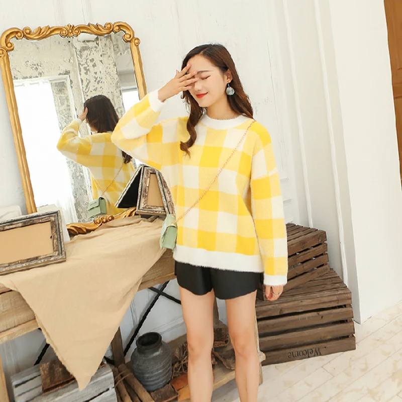 Promo 2019 Autumn Winter Thick Wool Sweater Women Round Neck Plaid Loose Pullover Casual O-Neck Long Sleeve Pink Gray Blue Green Top