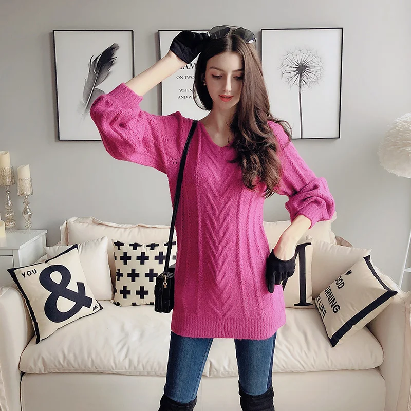 Sale Dabuwawa Women Lantern Sleeve Hollow Out Elegant Rib Knitted Sweaters Rose Purple Casual Long Pullover Sweater Ladies DN1DKT036