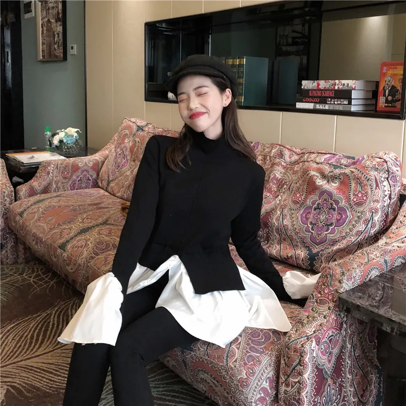 New Patchwork Pullovers Knitted Sweater For Women Turtleneck Flare Sleeve Irregular Female Jumper Sweaters Female 2019 Fashion New