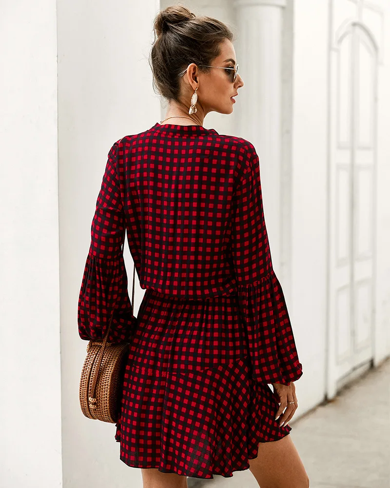 Get this 2020 New Cotton Plaid Dress Ladies Stand Collar Checked Print Knee-length Ruffle Dresses Women Waisted A-line Spring Shirt Dress with limited time discount by pressing the button below