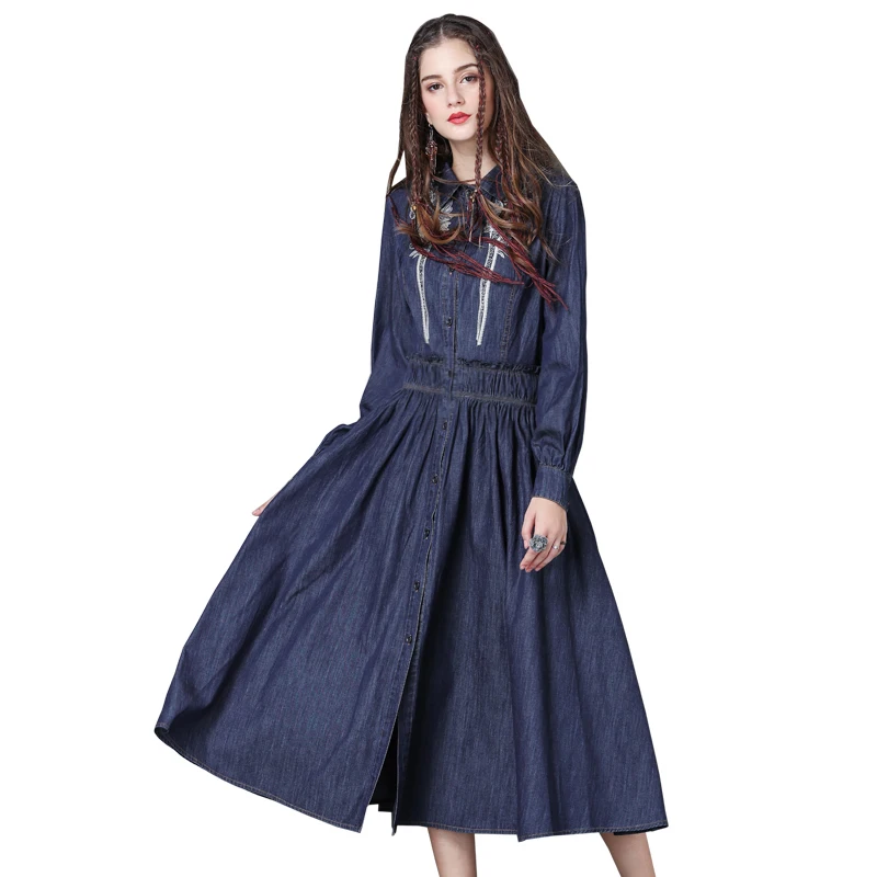 New Free Shiping 2017 Vintage Women Long Mid-calf Long Sleeve Autumn Denim Cotton Dress Embroidery S-L Dresses A-line Elastic Waist